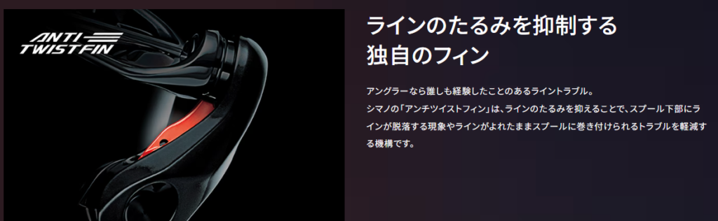 特徴として、シマノのアンチツイストフィンらしきものが搭載されている。